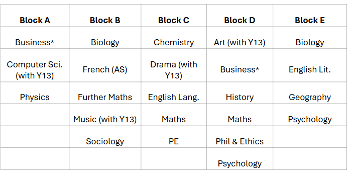 Our option blocks for September 2026 entry are below - please note Business must be chosen in Block A and Block D